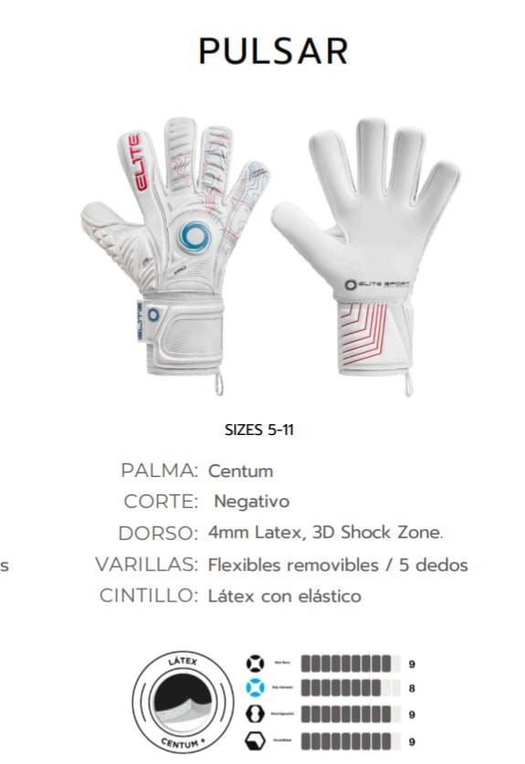 Tamaños: Disponibles en tallas del 5 al 11, los guantes Pulsar están diseñados para adaptarse a porteros de todas las edades y niveles de habilidad.